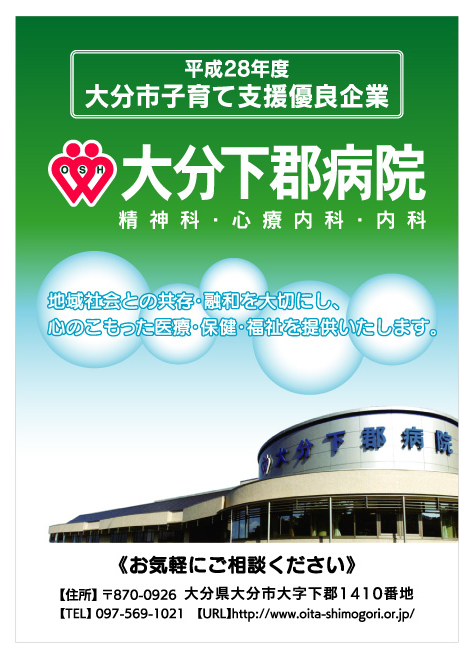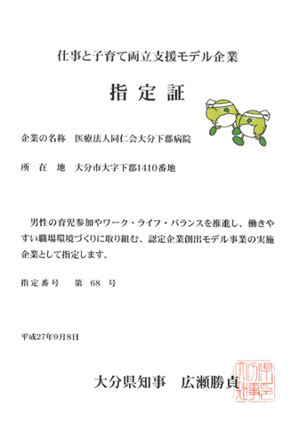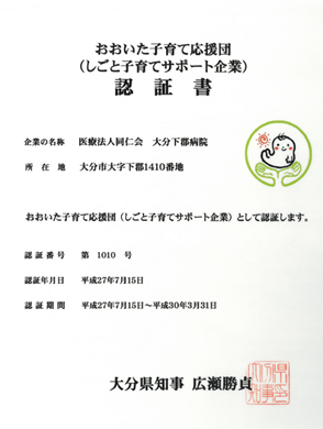 当院では、「次世代育成支援対策推進法」に基く、「一般事業主行動計画」を策定し、子育てと仕事を両立できる環境づくりに努めており、大分県より、『仕事と子育て両立支援モデル企業』に指定を受けております。