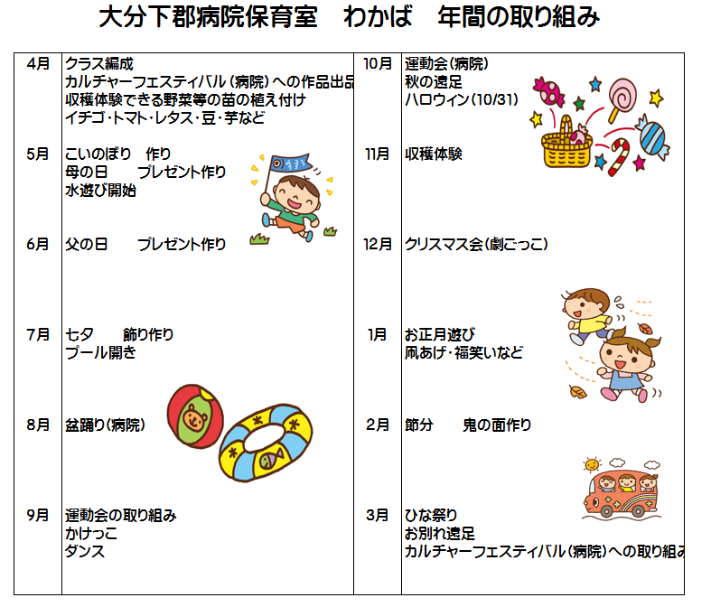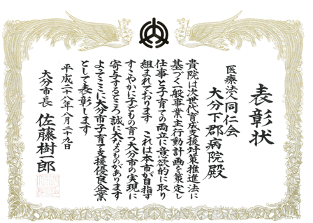 当院では、「次世代育成支援対策推進法」に基く、「一般事業主行動計画」を策定し、子育てと仕事を両立できる環境づくりに努めており、大分県より、『仕事と子育て両立支援モデル企業』に指定を受けております。